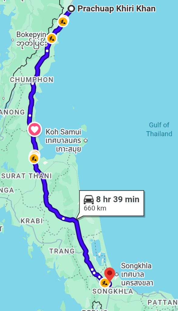 I started around 7 am and arrived around 4 pm at my hotel in Hat Yai. It was a long day in the hot sun and dusty road! At one stop along the way a guy asked me about my motorcycle, he hadn’t seen the Cfmoto brand before, so we started talking and I immediately recognized his norwegian english accent. After that we switched to swedish and norwegian and he told me scandinavia this time of year was horrible and that he spends the wintermonths in Thailand. He had a Thai spouse and they were on the way from her Hua Hin place to see her parents in Phattalung. Interesting the conversations you have when you’re on a bike and on your own!